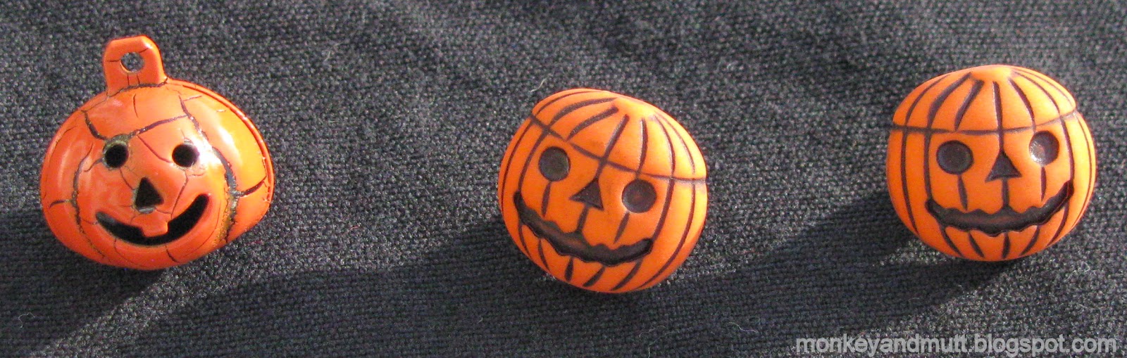 I also adore bells.  The first pumpkin in the picture above is a little bell with the sweetest little jingle.  I cannot wait to use it and these adorable buttons on a block!  (I may have to make myself a Halloween purse. Glow-in-the-dark threads and fabrics and these adorable Jack-o-Lanterns would be PERFECT!)